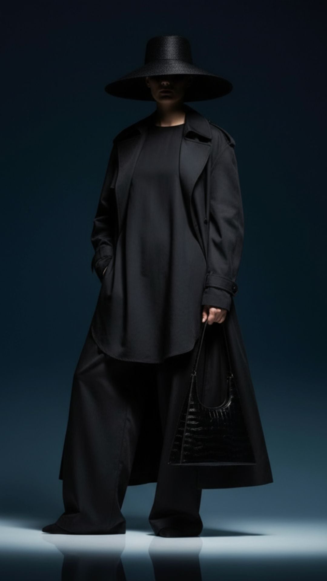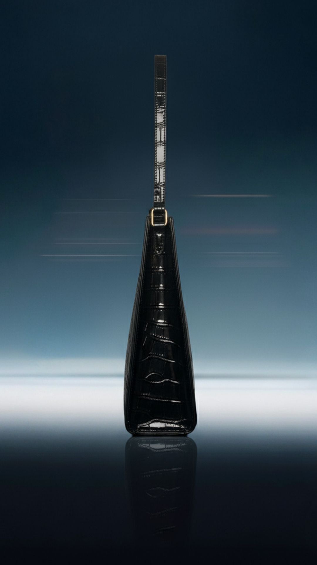 Vegan patent leather met een croc-structuur die je voelt als je kijkt. De driehoekige vorm is geen toevalligheid: het is balans. Een krachtige vorm die blijft, zelfs als jij beweegt.